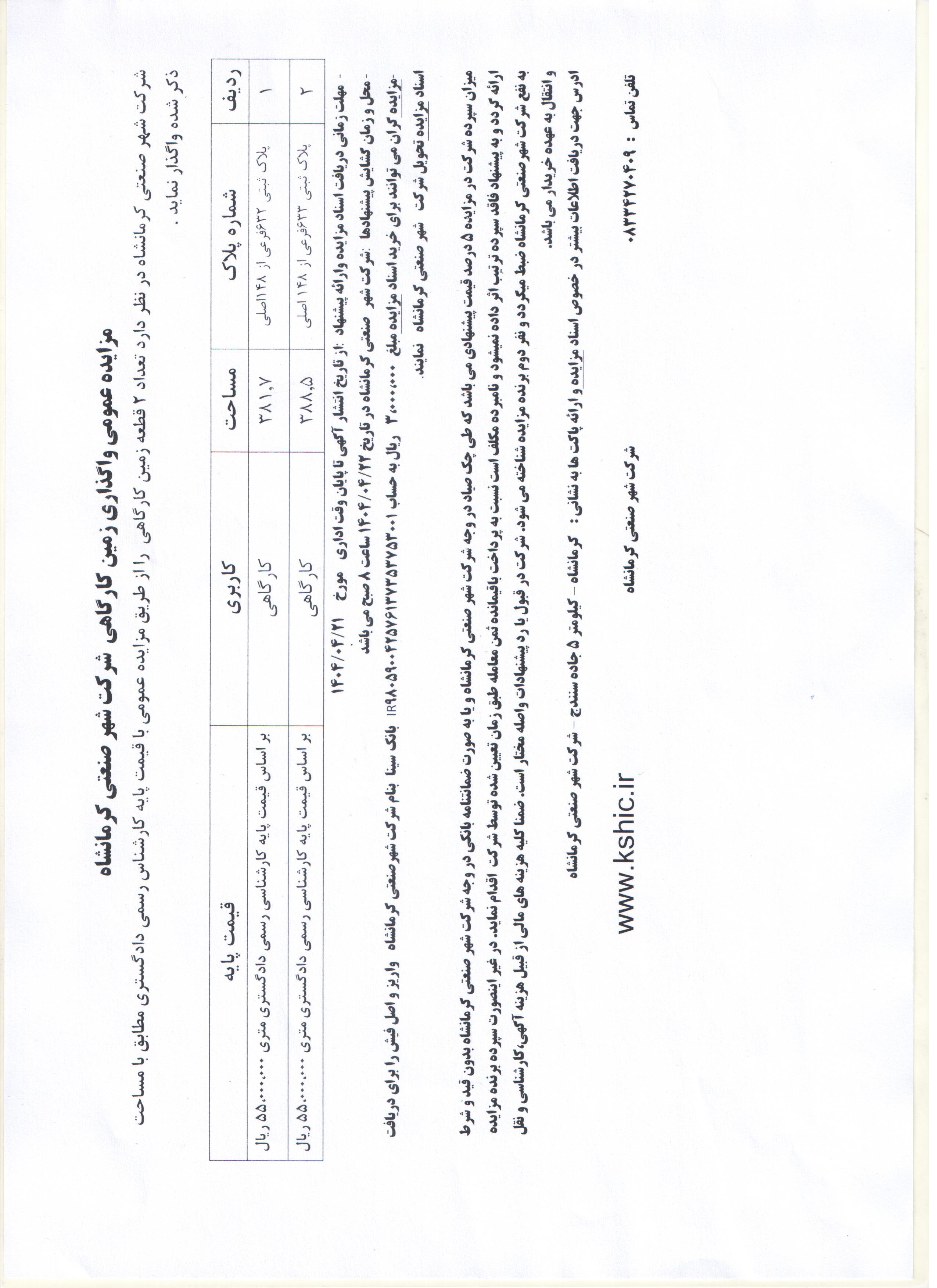 آگهی مزایده 2 قطعه زمین کارگاهی واقع در شهر صنعتی کرمانشاه اخبار 170 بازدید چاپ آگهی مزایده 2 قطعه زمین کارگاهی واقع در شهر صنعتی کرمانشاه